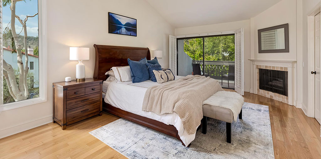 Welcome to this light and bright end-unit townhome situated in a peaceful and magical setting in the Pacific Palisades Highlands. This 2 bedroom plus loft, 2 ½ bathroom property offers a beautiful interior space including vaulted ceilings, ample windows capturing abundant sunlight. Large gated front patio, open floorplan from the living room to the kitchen. Kitchen is complete with ceaserstone countertops, white subway tile backsplash, wine refrigerator and a convertible space for a home office, breakfast area, etc. Perfect flow for entertaining. An oversized master bedroom suite with walk-in closet, balcony and bath with separate shower/tub and double vanity is a true retreat. Large en-suite second bedroom on the same floor as the master. Amenities include central air/heat, a 2 car private garage with direct access, large crown and base molding, and plantation shutters. The Michael Lane Villas community offers a beautiful pool, club house, exercise room, and close proximity to wonderful hiking trails and Casa Nostra.